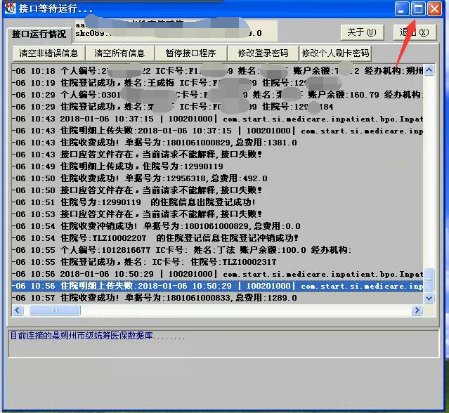 2.操作接口只出现了错误,失败等信息。请将医保接口最大化了,看里面的详细报错信息,如下图所示: